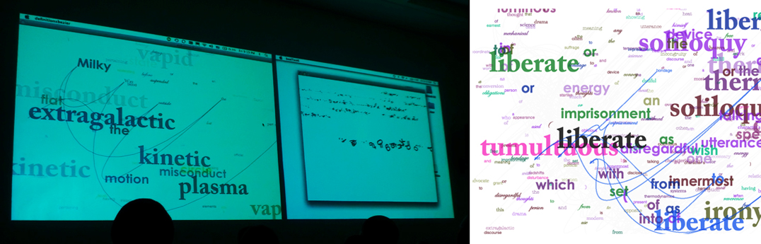 Following from research and ideas explored in my previous collaboration in generative handwriting in 2006 at NYU, this piece was developed during my residency at the School of Architecture, Design and Planning-Sydney in a Master class set up with the aim to develop collaborative work with undergradutate students from Design Computing with programming skills. This work was produced following my reserach interests in breaking and production of meanings, metamorphosis of words into other words, the non-semantic the visual, the oral, the blank page, the engagement of the reader/user in the shifting from the linguistic to the visual and back. To represent the broken and the formations of new meanings, in this work we create an aesthetic environment consisting of a blank page/screen, inviting the reader/user to click/touch the screen in order to generate words. This is an aesthetic trade found in most of my interactive work. As the user explores and experiences the work by connecting the random words appearing in the screen and assembling definitions, the accidental position of words produce new relationships, and in doing so, an on going process of meanings, connections and narratives; of shifting from the semantic linguistic meaning to the visual, from the literal, the transparent to the abstract; and simultaneously creating a poetic space of juxtaposed words, layers, and visual textualities. This shiting from the abstract to the transparent meaning is one of my undergoing research questions and as such a quality found in all my practice-based research.